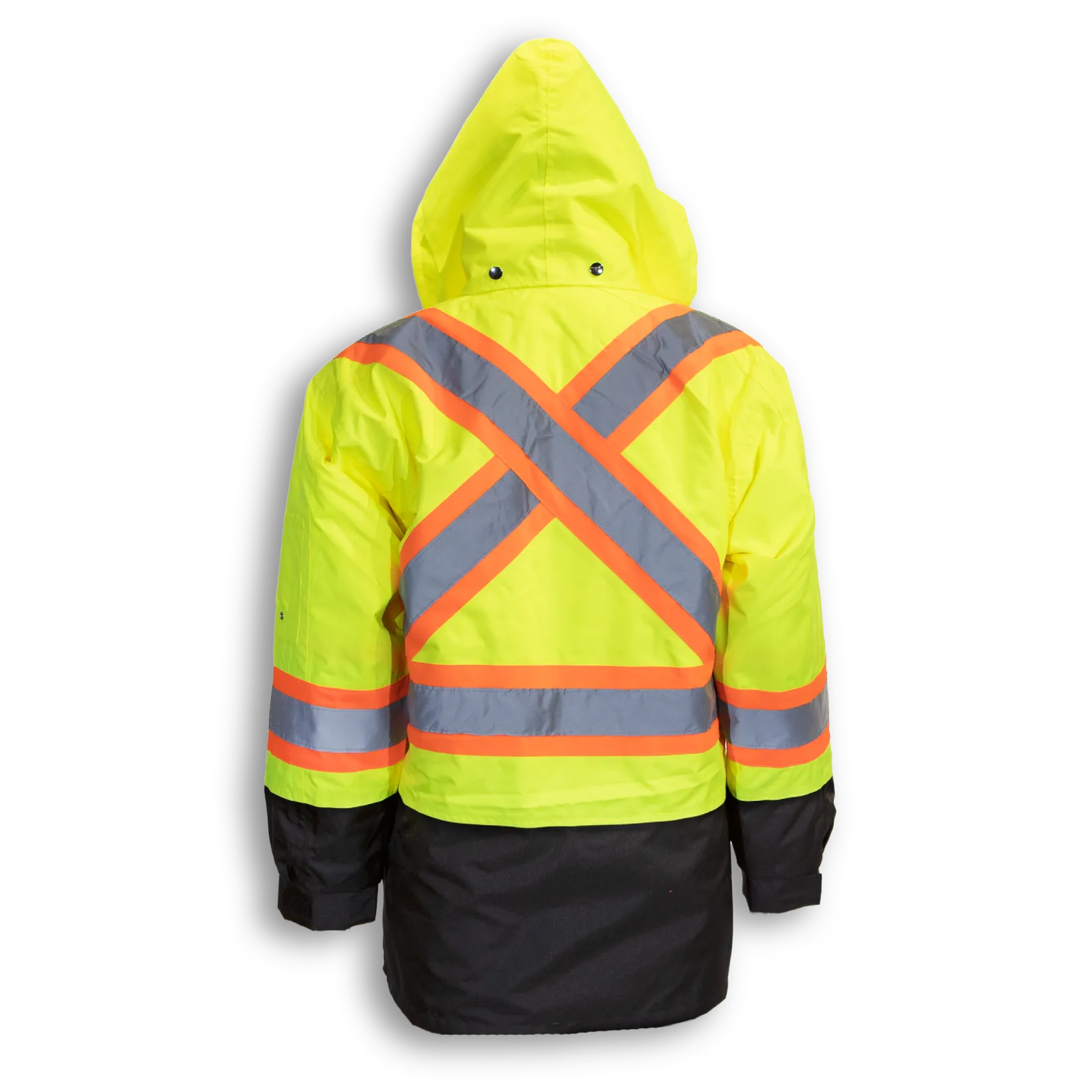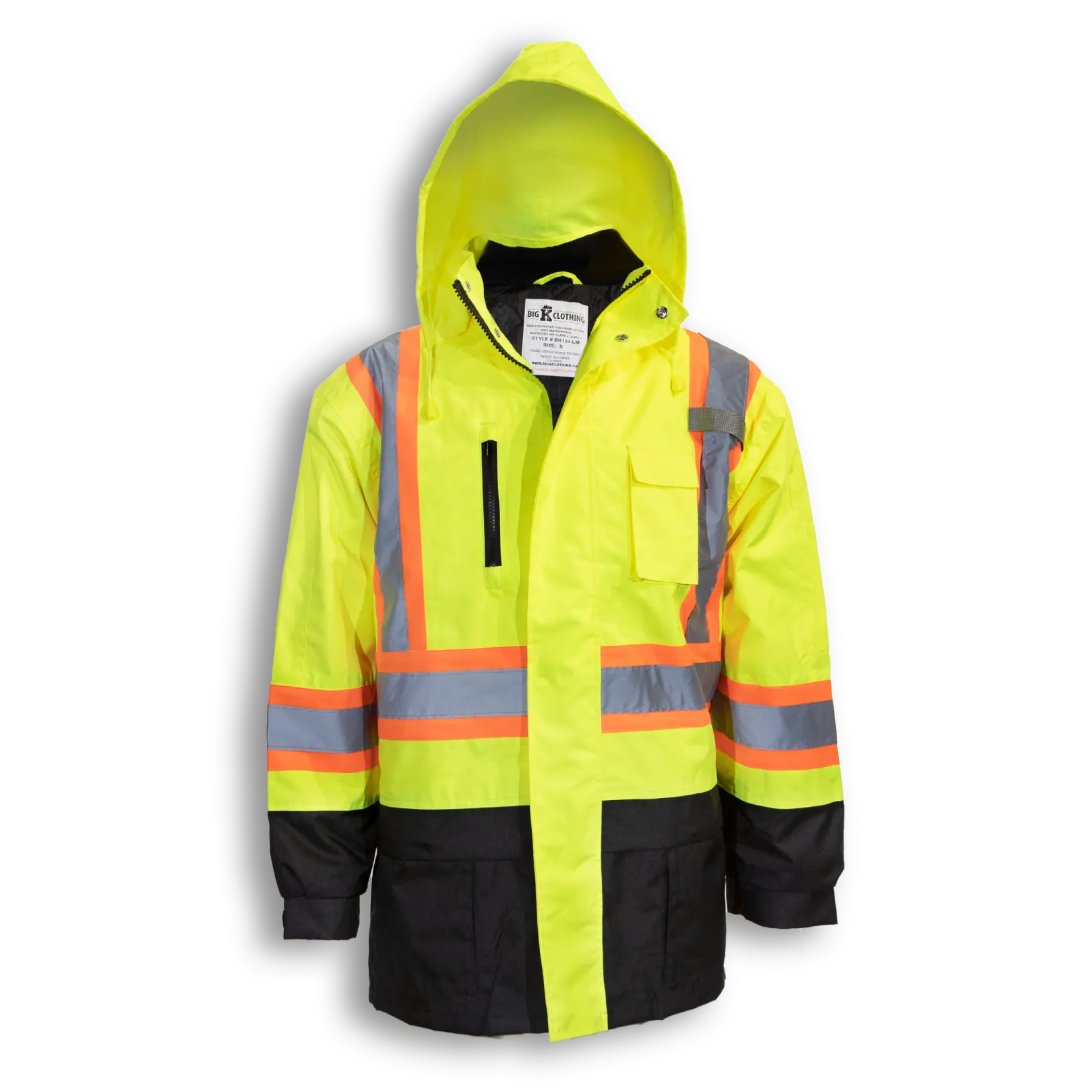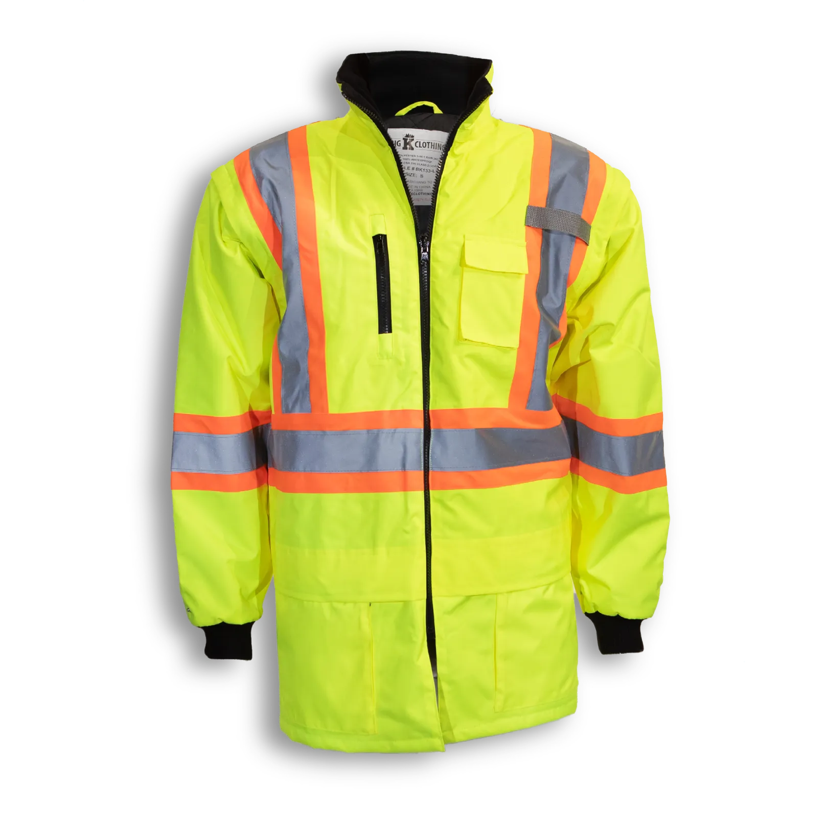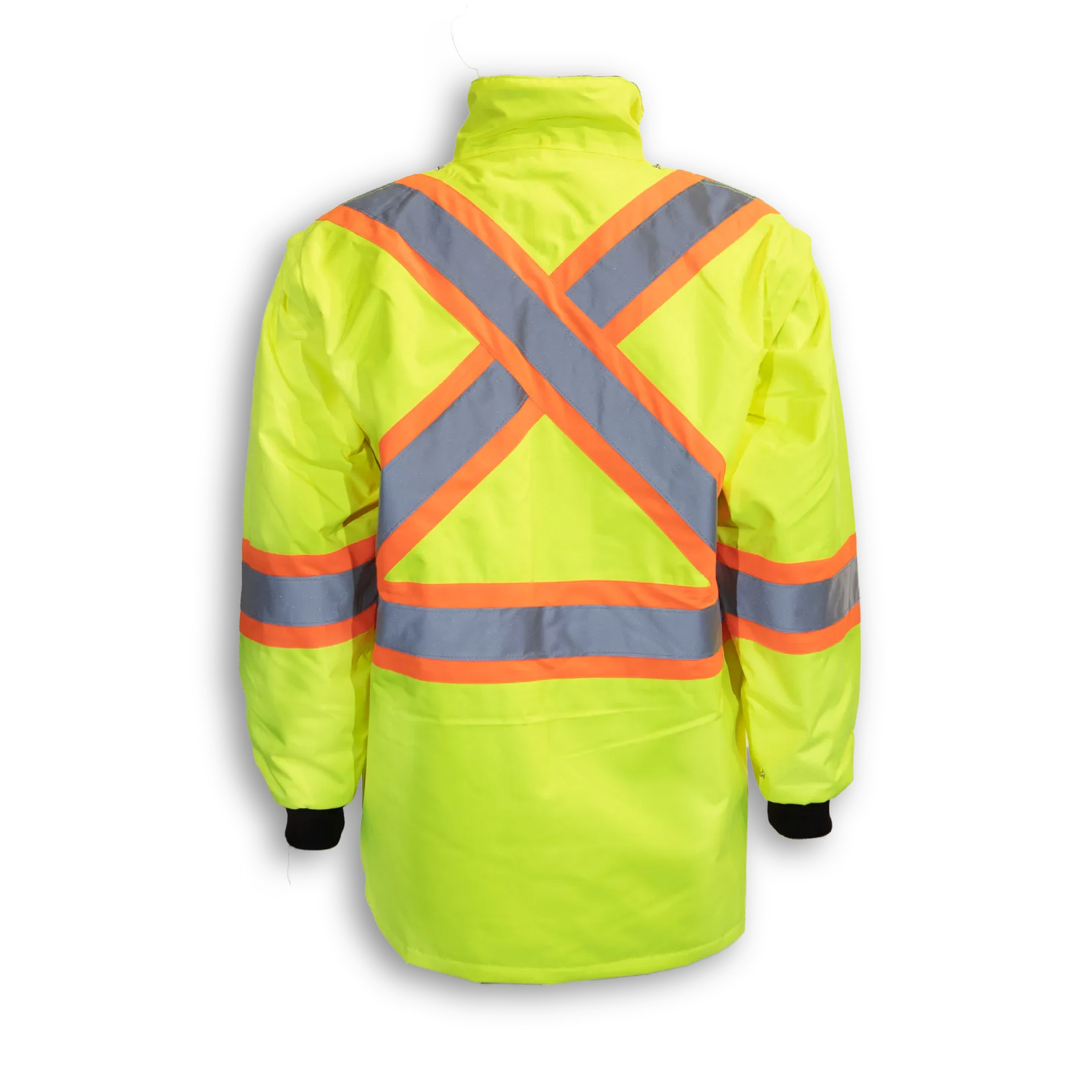 Our 300 denier polyester lime and black 100% waterproof rain jacket has removable quilt lining and removable sleeves with 4" reflective tape. It meets CSA Z96-22 Class 2, Level 2 standards.