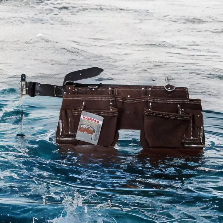 Introducing the Karma 11-Pocket Suede Leather Tool Pouch, a premium tool organizer that combines durability, functionality, and style. Crafted from high-quality suede leather, this tool pouch is designed to endure the rigors of daily use. What sets our tool pouch apart is the meticulous attention to detail. It features a robust metal buckle with a leather/nylon belt, ensuring a secure and adjustable fit. Rivet reinforcement adds extra strength, making this pouch a reliable companion for your tools. The double-needle buckle and four 'D' rings for suspenders provide further stability and versatility. Additionally, the pouch boasts two metal hammer holders, enhancing your convenience while working. Choose the Karma 11-Pocket Suede Leather Tool Pouch for a dependable and well-organized tool carrying solution. Elevate your craftsmanship with a tool pouch that's built to last and keep your tools within easy reach.
